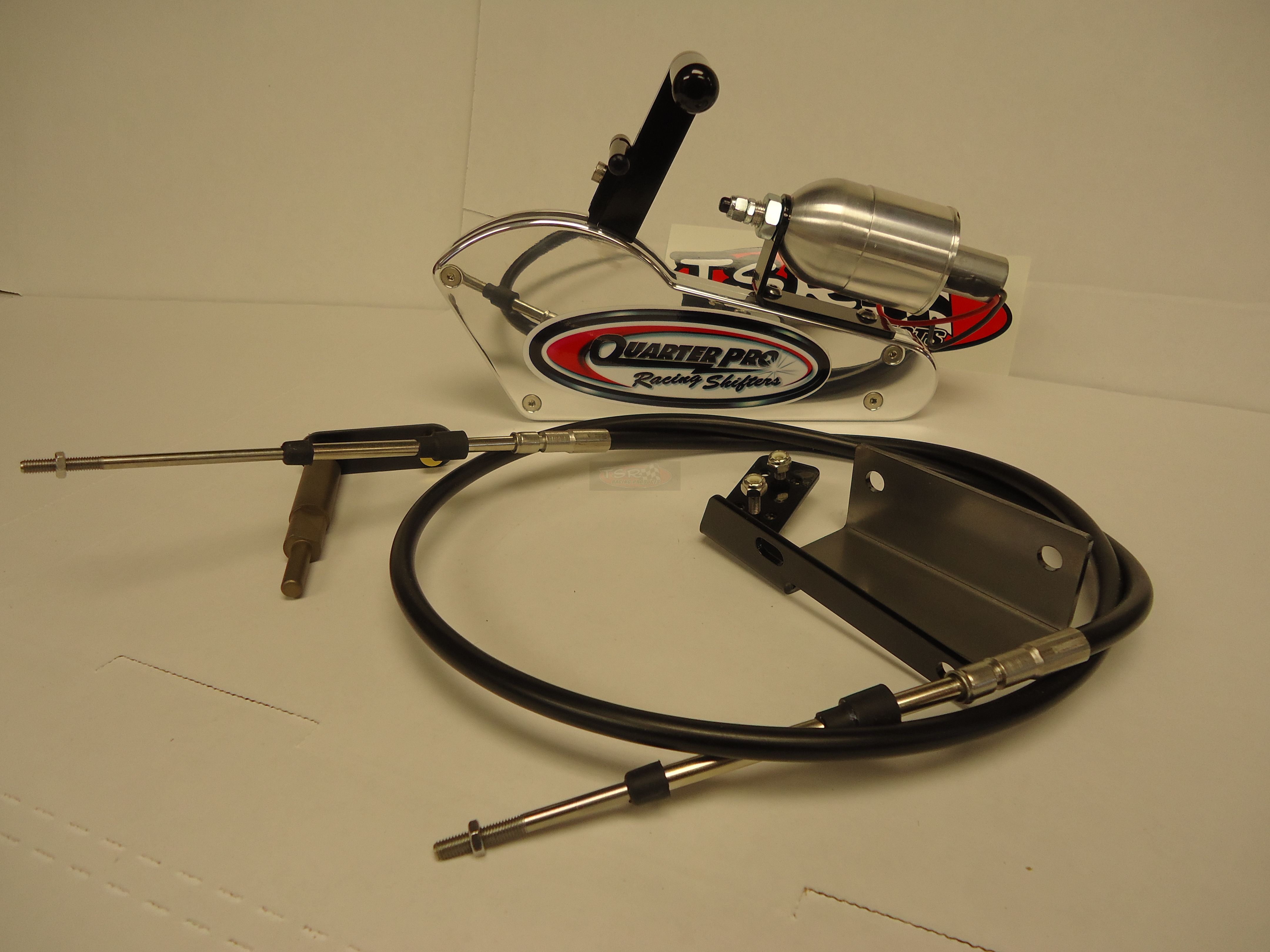 Year 62-73 MRC Quarter Pro Shifter‚ Powerglide Electric This is an electrically operated shifter. The Quarter Pro is very compact‚ measuring only 10” long‚ 8” high and 1” thick. Features billet aluminum construction‚ rear exit cable‚ shift lever‚ pan bracket & hardware. Can be changed at a later date to CO2 operation. Your choice of 5’ or 11’ cable‚ please specify. Note: This shifter is availble in left hand operation as well‚ special order; allow 3 weeks delivery. Please specify below.